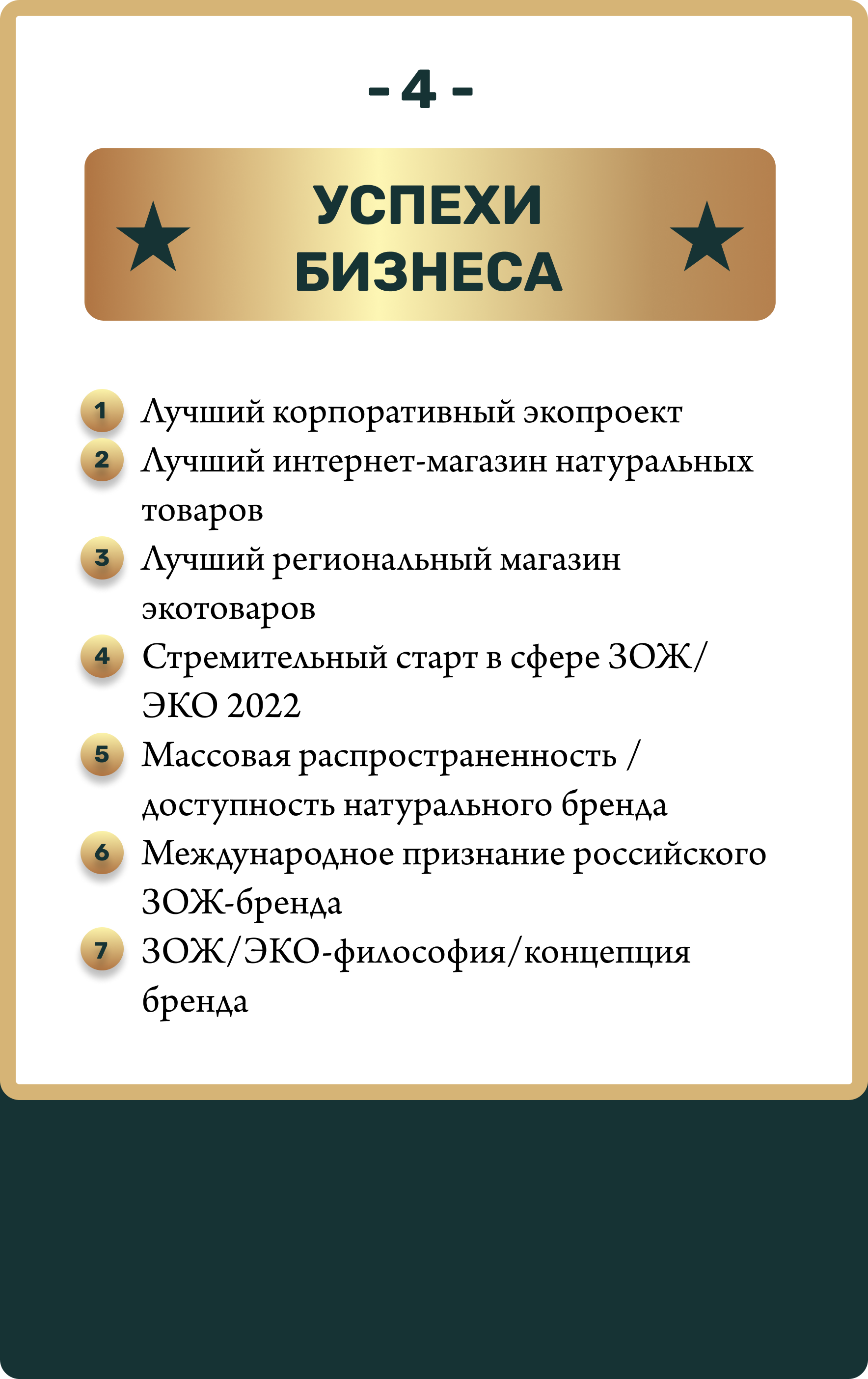 Вдохновить и поощрить малый, средний и крупный бизнес на внедрение eco-friendly инициатив, ЗОЖ-проектов. Способствовать развитию рынка натуральной косметики и здорового питания в России